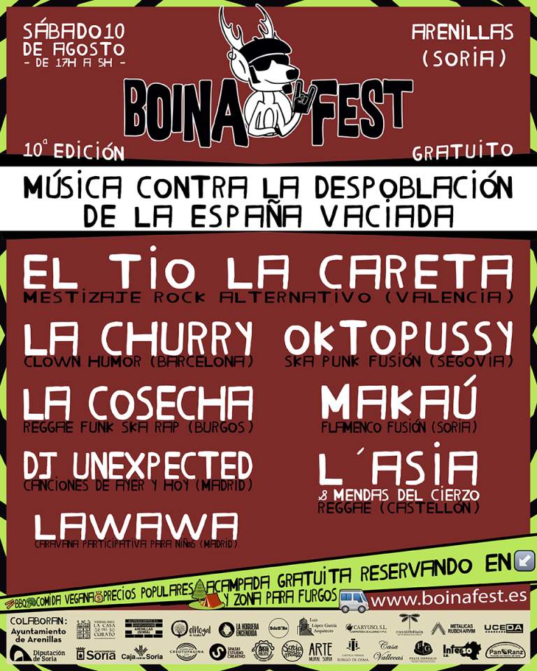 El próximo 10 de agosto se celebrará la 10ª edición del Boina Fest en Arenillas (Soria). Un pequeño municipio del sur de Soria de apenas 50 habitantes conocido por su lucha contra la despoblación y en donde, tras 9 ediciones en constante crecimiento, se espera una asistencia similar a la de años anteriores por encima de las 1000 personas. Una vez ya anunciados los artistas de zonas despobladas, el festival completa hoy el cartel con los artistas que actuarán en su décimo cumpleaños.