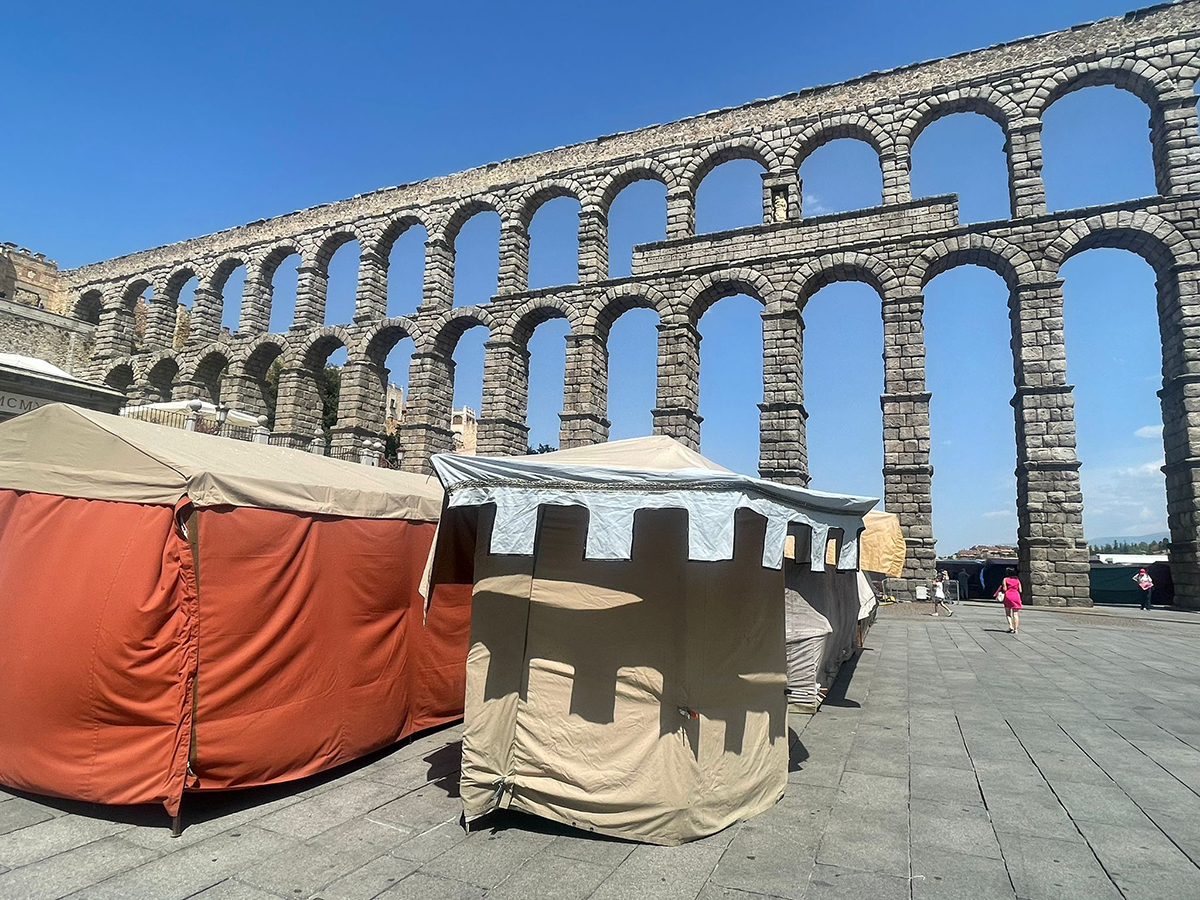 Esta mañana han dado comienzo los trabajos de montaje de más de un centenar de puestos que este fin de semana ambientarán el entorno del Acueducto como antiguo mercado romano. Una de las prioridades en el montaje, desmontaje y celebración del mismo es la protección del monumento Patrimonio de la Humanidad, para lo que la Concejalía de Turismo está siendo muy cuidadosa. Por este motivo un equipo de voluntarios ofrecerá información tanto a visitantes como participantes distribuyendo un marcapáginas con las normas básicas de cuidado del monumento durante todo el fin de semana.
