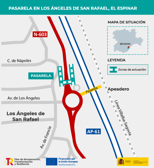 El Ministerio de Transportes y Movilidad Sostenible avanza en la ejecución de las obras de construcción de una pasarela peatonal en el kilómetro 71,150 de la carretera N-603, en Los Ángeles de San Rafael (municipio de El Espinar), en la provincia de Segovia.