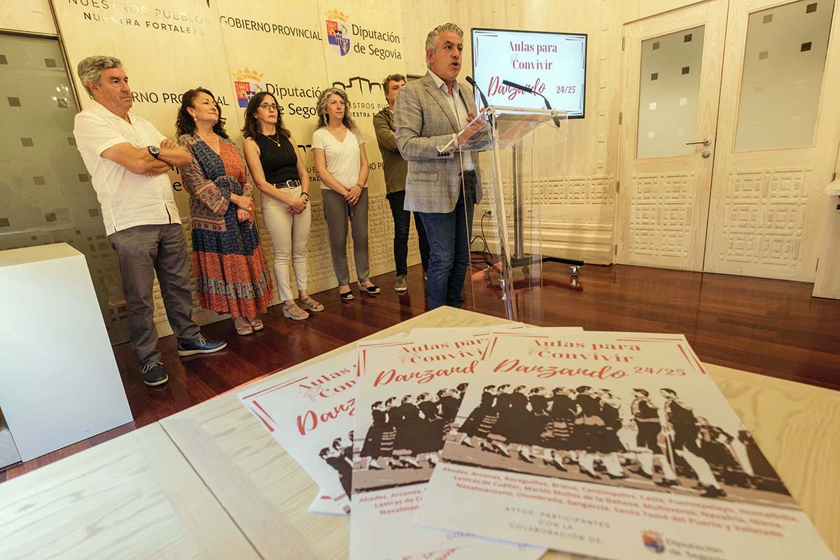 El diputado de Cultura, Juventud y Deportes, José María Bravo, acompañado de varios alcaldes de los municipios beneficiarios de la subvención, ha presentado el nuevo programa cultural de la Diputación de Segovia, ‘Aulas para Convivir Danzando’, inspirado en el de ‘Aulas para Convivir Cantando’, que busca fomentar la práctica de la danza, y al mismo tiempo contribuir a la animación y convivencia en las localidades en las que se realiza.