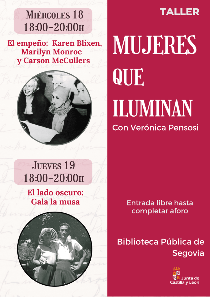 El miércoles 18 y el jueves 19 a las 18.00 se realizarán estos talleres. El primero titulado ‘La resiliencia: Tres damas y un destino’, en el que se hablará de Karen Blixen, autora de Memorias de África, Marilyn Monroe, actriz estadounidense, y Carson McCullers, escritora de El corazón es un cazador solitario. El segundo será ‘El lado oscuro: Gala la musa’, en el que se reflexionará sobre la figura de la musa en el arte a través de Gala Dalí, artista surrealista y musa de sus maridos Paul Éluard y Salvador Dalí.