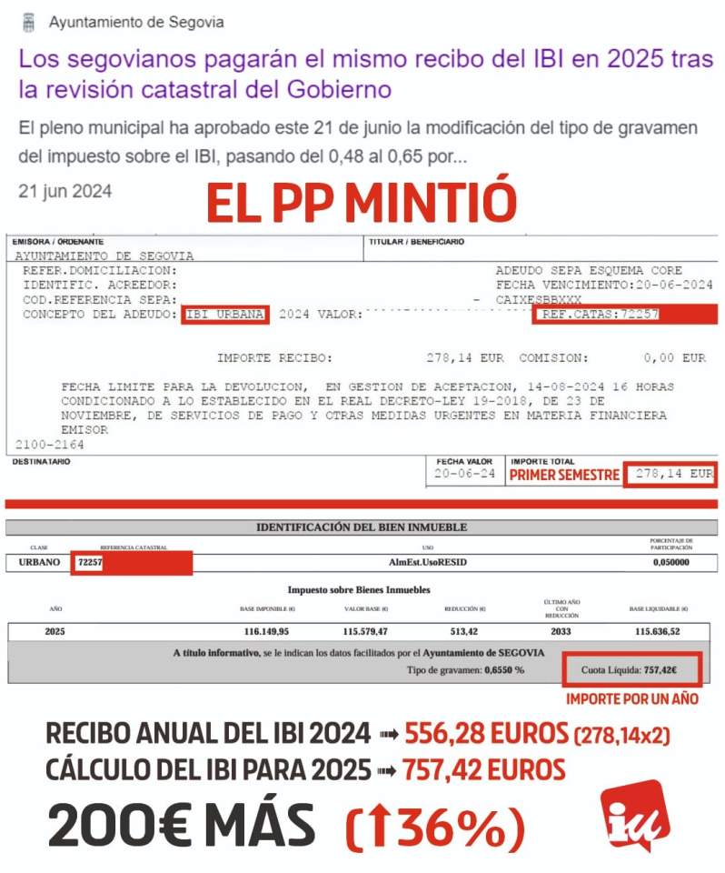 El PP modificó en junio el tipo de gravamen del IBI (de 0,48 a 0,65) para compensar la reducción generalizada de los valores catastrales de los inmuebles de Segovia. El Gobierno de Mazarías aseguró que los recibos del IBI no iban a experimentar modificaciones significativas. La realidad es que, aunque haya casos de pequeñas bajadas en los recibos, se están produciendo otros de importantes subidas del IBI. Vecinos de la ciudad han hecho llegar IU recibos que muestran una subida anual de 200 euros, más de un 36 por ciento.