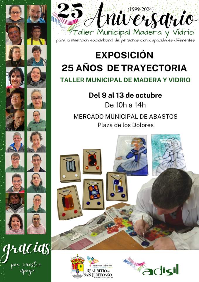 Este otoño viene cargo de actividades para el Taller Municipal de Madera y Vidrio del Real Sitio de San Ildefonso. Del 9 al 13 de octubre se puede visitar la exposición “Una trayectoria.25 años del Taller Municipal de Madera y Vidrio” en el Mercado Municipal Abastos del municipio. (Pza. de los Dolores) en el horario de 10:00h a 14:00h. Una retrospectiva para conmemorar más de dos décadas de lucha por la integración real e igualitaria de personas con diferentes capacidades y nos invita a reflexionar sobre la importancia de que todos los individuos seamos miembros activos y participativos de nuestra sociedad.