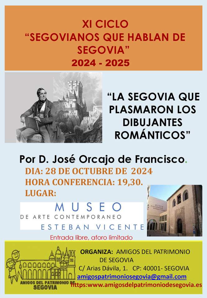 La conferencia inaugural va a estar a cargo de D. José Orcajo de Francisco con el tema “LA SEGOVIA QUE PLASMARON LOS DIBUJANTES ROMANTICOS”. Lo hará con la proyección de interesantes grabados de la época, algunos inéditos, que, sin duda enriquecerán y harán muy amena la exposición.