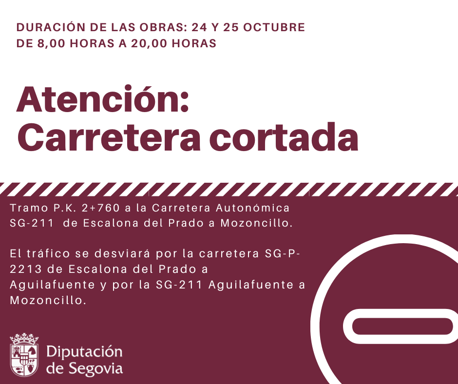 La Diputación de Segovia va a reanudar las obras de Refuerzo del firme en la SG-V-2201 entre Escalona del Prado y Mozoncillo, para lo que será necesario cortar el tráfico en el tramo de la carretera desde la P.K. 2+760 a la Carretera Autonómica SG-211, mañana jueves 24 y el viernes 25 de octubre, desde las ocho de la mañana hasta las ocho de la tarde, dejando abierto al tráfico las noches de dichos días. Mientras se encuentren activos los trabajos, el tráfico se desviará por la carretera SG-P-2213 de Escalona del Prado a Aguilafuente y por la SG-211 Aguilafuente a Mozoncillo. Para garantizar la seguridad de los conductores, el corte y los desvíos estarán señalizados con carteles en la carretera y señalistas. Además, desde el servicio de Infraestructura y Obras de la institución provincial informan de que el corte podría sufrir modificaciones debido a las inclemencias meteorológicas.