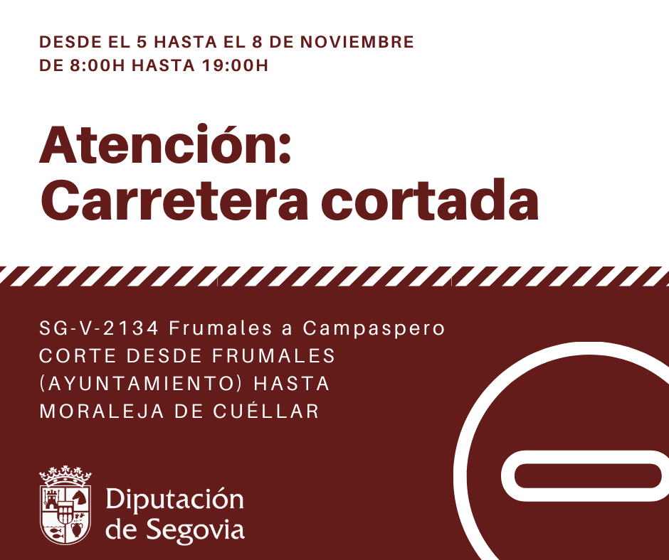 La Diputación de Segovia va a proceder a realizar obras de mejora del firme en la SG-V-2134 (la que va de Frumales a Campaspero). Los trabajos se van a centrar en el tramo comprendido entre Frumales y Moraleja de Cuéllar, es decir, del punto kilométrico 0+940 al 4+390. Esto obligará a cortar el tráfico en ese segmento los días 5, 6, 7 y 8 de noviembre, ambos inclusive, desde las ocho de la mañana hasta las siete de la tarde. En concreto, el corte se produce junto al Ayuntamiento de Frumales, al inicio de la calle Real.