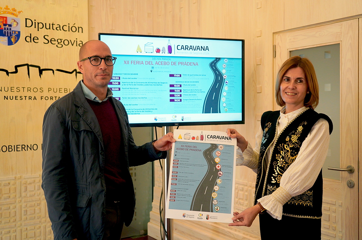 La Caravana de Alimentos de Segovia, que organiza la Diputación, finalizará su recorrido de 2024 con la décima parada en la XII Feria del Acebo de Prádena que tendrá lugar los días 7 y 8 de diciembre en la Plaza Mayor de dicha localidad, donde los productos de la marca agroalimentaria de la institución provincial junto a los puestos de adornos navideños harán las delicias de los presentes.