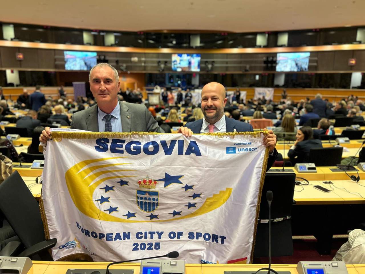 El alcalde de Segovia, José Mazarías, y el concejal de Deportes Jesús Garrido, han recibido este 12 de diciembre la acreditación de Segovia como “Ciudad Europea del Deporte” en el año 2025. La entrega se ha llevado a cabo durante la gala del 25 aniversario de la organización ACES, evento que ha tenido lugar en el Parlamento europeo, en Bruselas (Bélgica) bajo la presidencia de Gian Franco Lupatelli y con asistencia de autoridades comunitarias, entre ellos el comisario europeo de Equidad Intergeneracional, Cultura, Juventud y Deportes, Len Micaleff.
