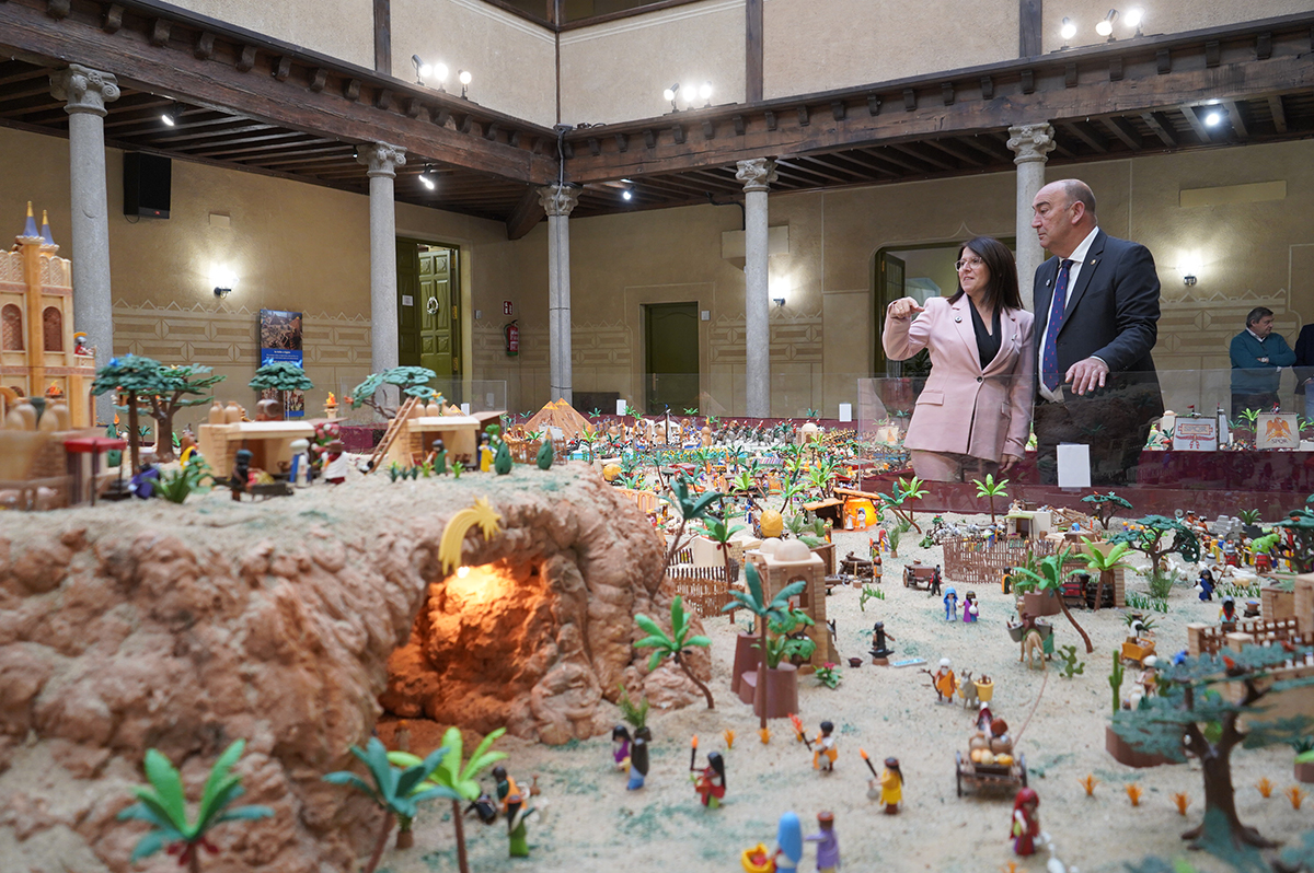 Una de las tradiciones más bonitas y mágicas de la Navidad vuelve al Patio de Columnas del Palacio Provincial con el Belén de Playmobil que este año volverá a sorprender con la incorporación de nuevas escenas formadas por cerca de 10.000 piezas. Así, no faltarán las escenas más tradicionales como la anunciación a María, la anunciación a los pastores, el Nacimiento, la matanza de los inocentes o la huida a Egipto; para dar paso a los Reyes Magos cuando abandonan el castillo de Herodes, la zona de villas romanas la de los templos romanos, las termas romanas, el coliseo, el circo con carrera de cuadrigas, el campamento romano o la tribuna con el ejército y un censor romano, que se han incorporado este año. El agua también tiene un protagonismo importante en esta representación con la escena de lavanderas en el río, la lonja de pesca a orillas del Nilo o el mercado de esclavos en el puerto. Además, podemos encontrar el mercado con diferentes puestos y actividades lúdicas que nos dejan también adentrarnos en amplias escenas de oficios donde no falta el alfarero, el herrero, el panadero o el carpintero. En la inauguración del Belén, que ha tenido lugar esta mañana, el presidente de la Diputación, Miguel Ángel de Vicente ha valorado “el minucioso trabajo que se ha llevado a cabo para volver a dejarnos con la boca abierta por la cantidad de detalles con los que cuenta esta representación”. Una representación que ha vuelto a dirigir la alcaldesa de Espirdo y diputada nacional, María Cuesta que “no sólo cede todas estas piezas que forman parte de su colección, sino que invierte muchas horas de su tiempo para que el resultado sea impecable”, ha destacado De Vicente. Y es que han sido más de treinta horas las que María Cuesta ha empleado en la confección de este Belén, contando como siempre, con la ayuda de algunas de las integrantes de la asociación Espirdo Solidario.