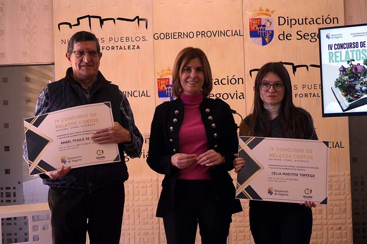 La diputada de Promoción Provincial y Desarrollo Rural Sostenible, Magdalena Rodríguez ha hecho entrega esta mañana, en el Salón del Trono del Palacio Provincial, de los premios a los ganadores de la IV edición del Concurso Provincial de Relatos Cortos ‘Escribe, Come y Disfruta’, una iniciativa que combina creatividad literaria y sensibilización sobre la alimentación sostenible y saludable. Celia Maestro, con su relato ‘Achicoria’ y Ángel Fraile de Pablo, con ‘Una cabeza confusa’, han sido los galardonados con el primer y segundo premio, por lo que se les ha dotado con 300 euros y 200 euros, respectivamente, además de recibir sendos lotes de productos de Alimentos de Segovia.