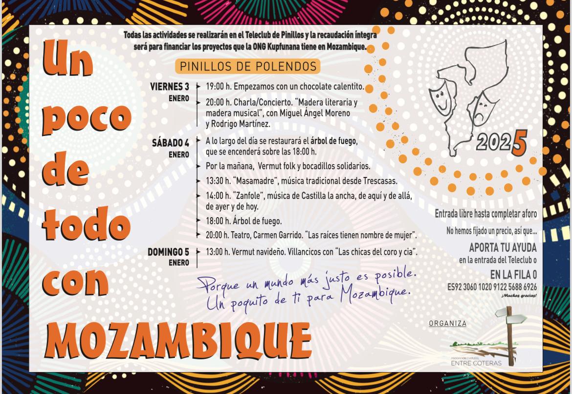 Todas las actuaciones previstas en “Un poco de todo con Mozambique” se realizarán en el teleclub de Pinillos y tienen entrada libre hasta completar el aforo. Desde la Asociación Cultural Entre Coteras no han querido fijar un precio para que cada persona se sienta libre de aportar su ayuda para Mozambique en la entrada o en la fila 0 habilitada al respecto en la cuenta: ES92 3060 1020 9122 5688 6926.