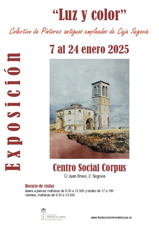 El espacio expositivo del Centro Social Corpus acogerá obras del Colectivo de Pintores de antiguos empleados de la desaparecida Caja Segovia. “Luz y color”, muestra técnicas dispares desde la acuarela, al acrílico, pasando por el óleo o el pastel... Todos los integrantes del grupo han encontrado en la pintura un camino para disfrutar del ocio en su nueva etapa, lo que le da un interés especial a la exposición que carece de la uniformidad que tendría la de un solo autor, pudiendo el visitante recrearse con una gran diversidad de técnicas, colores, estilos y formatos.