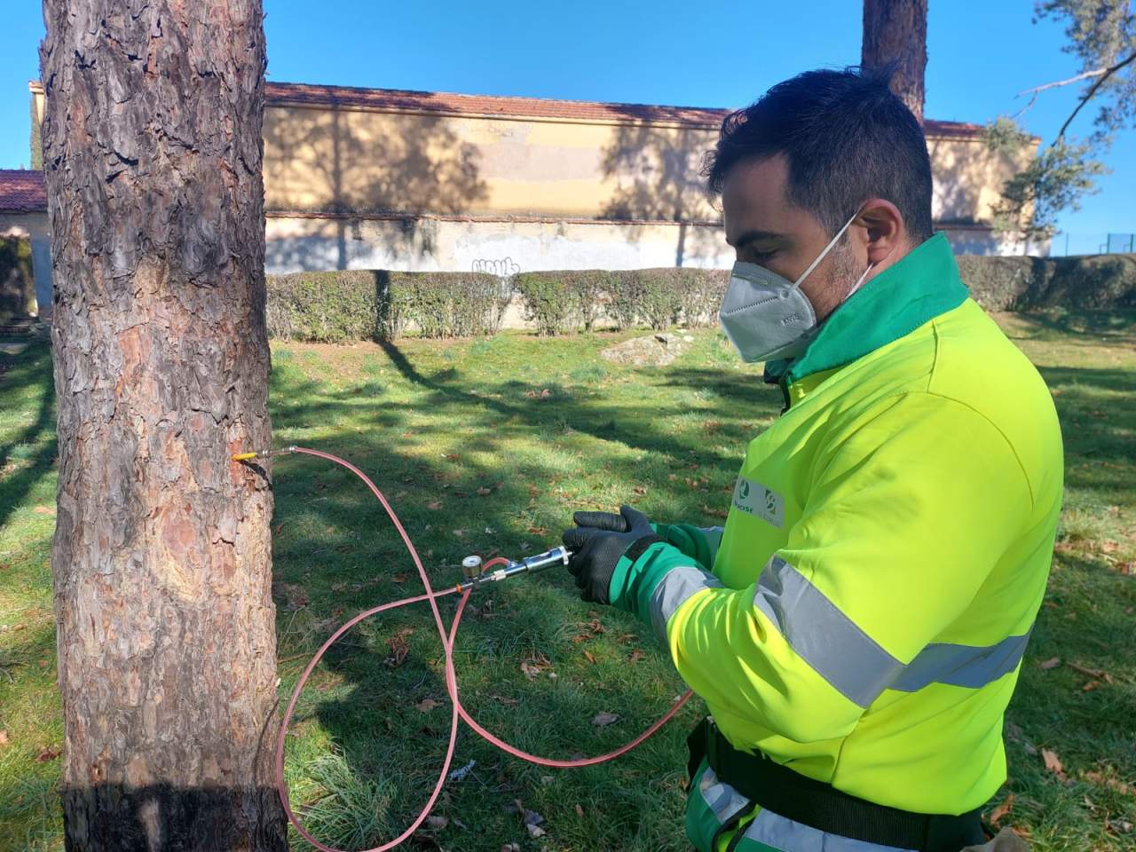 El Ayuntamiento de Segovia, a través del área de Sostenibilidad Ambiental, está aplicando en diferentes zonas verdes de la ciudad un tratamiento de endoterapia arbórea para tratar los nidos de procesionaria que están afectando a numerosos ejemplares de pino silvestre y coníferas y para prevenir su aparición la próxima primavera que, aparte de causar daños en los árboles, podrían tener efectos sobre la salud.