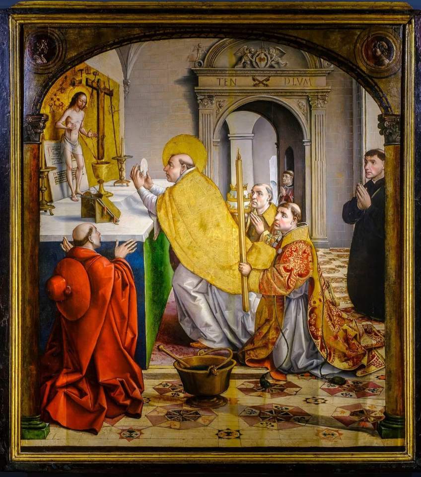 La escena representa el momento de la consagración de la Eucaristía por el Papa Gregorio Magno (540-604) un día de Navidad en la basílica romana de Santa Cruz de Roma. La escena que representa es el momento de la Transubstanciación, cuando el Papa Gregorio se arrodilla ante el altar en ese momento de la consagración. El Papa está acompañado de un cardenal y acólitos.