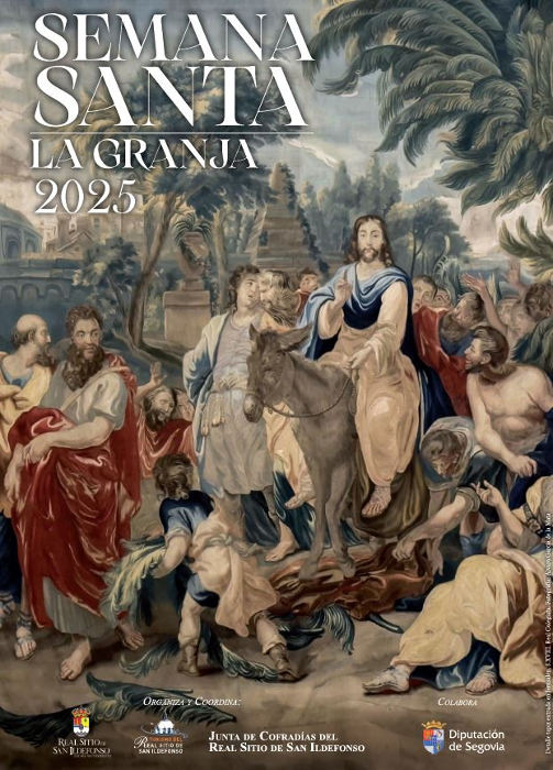El cartel anunciador está dedicado este año al tapiz “Entrada a Jerusalén” (siglo XVIII), que podemos encontrar en la Real Colegiata del Palacio Real de La Granja y que se ha elegido con motivo de la conmemoración del 300 aniversario de la fundación del Cabildo de la Real e Insigne Colegiada de la Santísima Trinidad. Un año muy especial en el que se celebra el nacimiento una institución de sacerdotes con el Abad a la cabeza que, durante tres siglos, ha sido parte importante en la creación, promoción, organización y participación de la Semana Santa del Real Sitio de San Ildefonso.