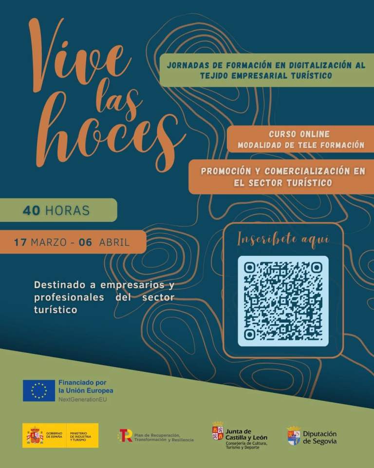 Las jornadas, que darán inicio el lunes 17 de marzo y se extenderán hasta julio, están dirigidas a profesionales del sector turístico, estudiantes y recién graduados en Turismo y Marketing, y empresas y emprendedores interesados en digitalizar sus servicios. También está dirigido a organismos públicos relacionados con el turismo, responsables de marketing en empresas turísticas, consultores y asesores en turismo digital o personas que deseen actualizar sus conocimientos en estrategias digitales aplicadas al sector turístico. Tendrán prioridad las personas y empresas ubicadas en el nordeste de la provincia, al estar incluido en el ‘Plan Hoces de Segovia’ y después los del resto del territorio, estudiantes y otras provincias de Castilla y León. Los interesados ya pueden inscribirse en Strategia Infinita, empresa encargada de impartir el curso; bien en la dirección de correo electrónico formacion@strategiainfinita.com, o bien en el número de teléfono 983049880.