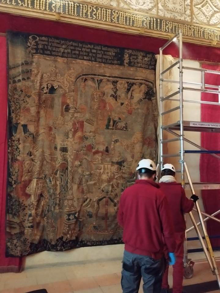 Tres de los magníficos tapices que se exhiben en el Alcázar de Segovia han sido esta mañana desmontados y embalados con destino a la Real Fábrica de Tapices para ser sometidos a una completa restauración.