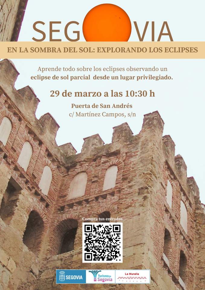 El eclipse parcial de sol que tendrá lugar el próximo sábado 29 de marzo se verá en Segovia y podrá disfrutarse desde un lugar privilegiado: el adarve de la muralla de Segovia, en la puerta de San Andrés. El área de Turismo de Segovia ha organizado una actividad de carácter divulgativo que estará dirigida por miembros de la asociación Hespérides, encabezados por su presidente, José Ignacio María Barreno, y su vicepresidente y coordinador de los temas de astronomía, Juan José García Pérez.