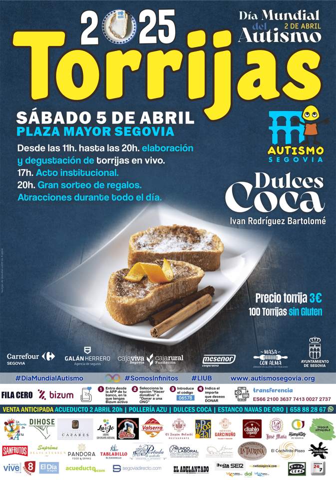 El sábado 5 de abril, a las 17.00 en la Plaza Mayor de Segovia, tenemos el acto central de la jornada, intentar batir un nuevo récord con 2025 torrijas hechas in situ desde las 11 de la mañana y hasta las ocho de la tarde. El repostero caucense, Iván Rodríguez Bartolomé, de Dulces Coca, será el encargado de su elaboración, y puesta en escena, cocinando “en vivo”en la misma Plaza Mayor. El precio de la torrija es de 3€ y el importe íntegro es para la asociación. Desde aquí queremos animar a la sociedad segoviana a que nos ayude en este nuevo récord, mientras endulzamos la tarde, habrá música y sorteo de regalos de empresas segovianas. Disponemos también de torrijas sin gluten.