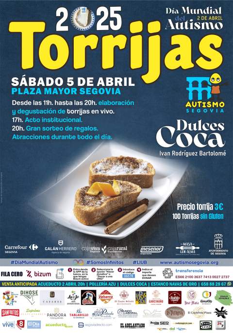 El 5 de abril, Autismo de Segovia volverá a intentar conseguir otro récord mundial. Desde las 11.00 h y hasta las 20.00 horas, el repostero Iván Rodríguez Bartolomé, de Dulces Coca, estará elaborando torrijas en la Plaza Mayor con la intención de llegar a las 2025. También habrá torrijas sin gluten. Cada una costará 3 euros y todo lo recaudado irá destinado a la asociación de Autismo para la construcción de su Centro de Día que, además, será centro especial de empleo. A lo largo de todo el día habrá música y sorteo de regalos de empresas segovianas.