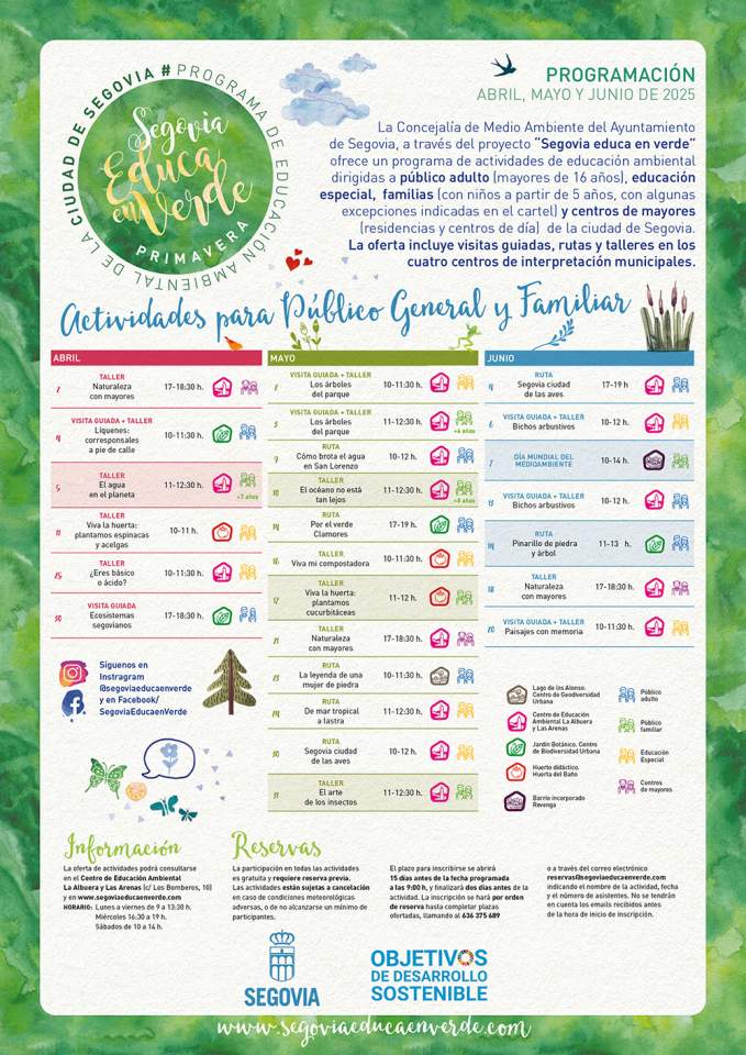 Toda la programación se puede consultar en el blog del programa www.segovieducaenverde.com o a través de Instagram y Facebook. La participación en todas las actividades es gratuita y requiere reserva previa llamando al teléfono 636 375 689 en horario de 0.00 a 13.30 horas o a través del correo electrónico reservas@segoviaeducaenverde.com, indicando el nombre de la actividad, fecha y número de asistentes. La inscripción se hará por orden de reserva hasta completar plazas.