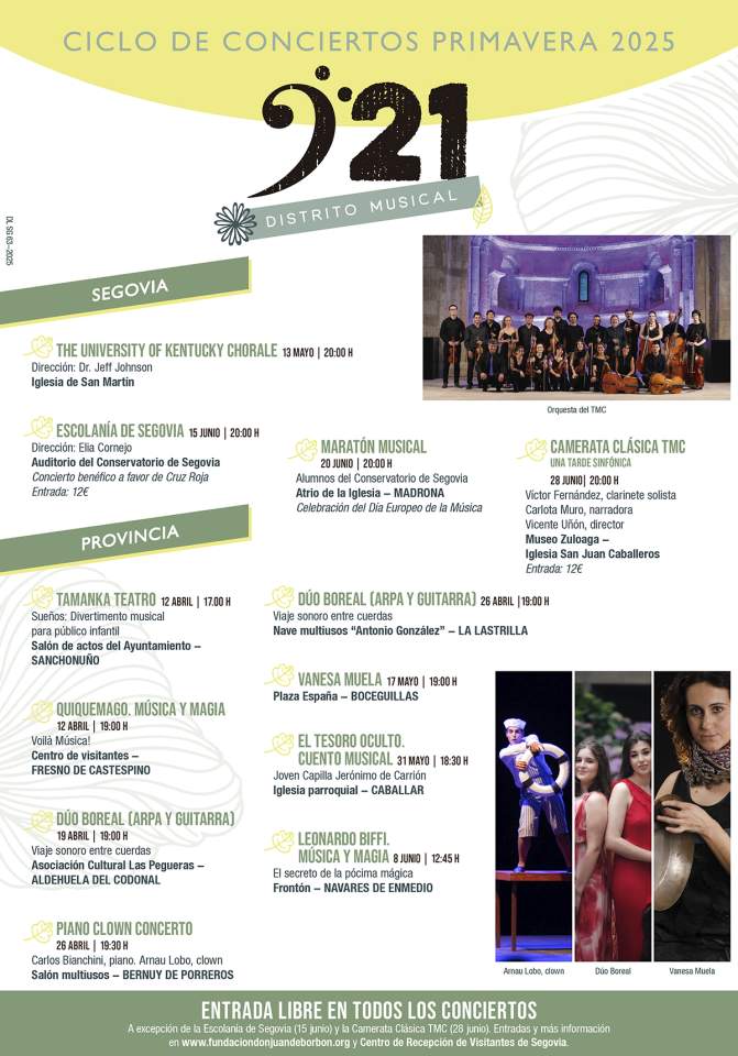 Toda la programación es de entrada libre hasta completar aforo —salvo los dos eventos señalados con entrada solidaria o venta anticipada— y puede consultarse en la página web de la Fundación Don Juan de Borbón: https://fundaciondonjuandeborbon.org/921-distrito-musical. Una invitación abierta al público para disfrutar de una primavera llena de arte, cultura y buena música, en un recorrido sonoro por la ciudad y la provincia de Segovia.