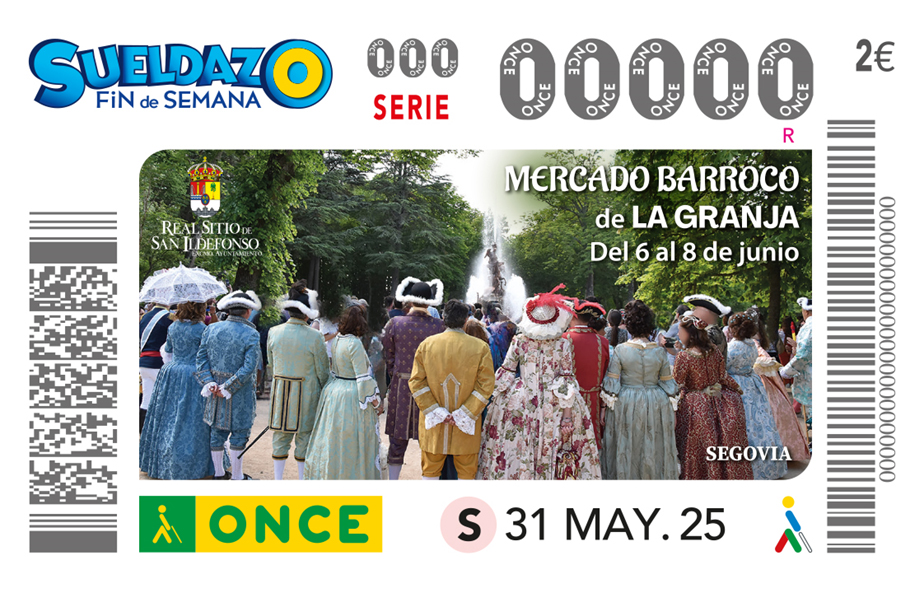 El Mercado Barroco de La Granja de San Ildefonso es el motivo del cupón de la ONCE del sábado, 31 de mayo. Cinco millones y medio de cupones difundirán esta fiesta de la localidad segoviana que lleva al visitante al esplendor del siglo XVIII.