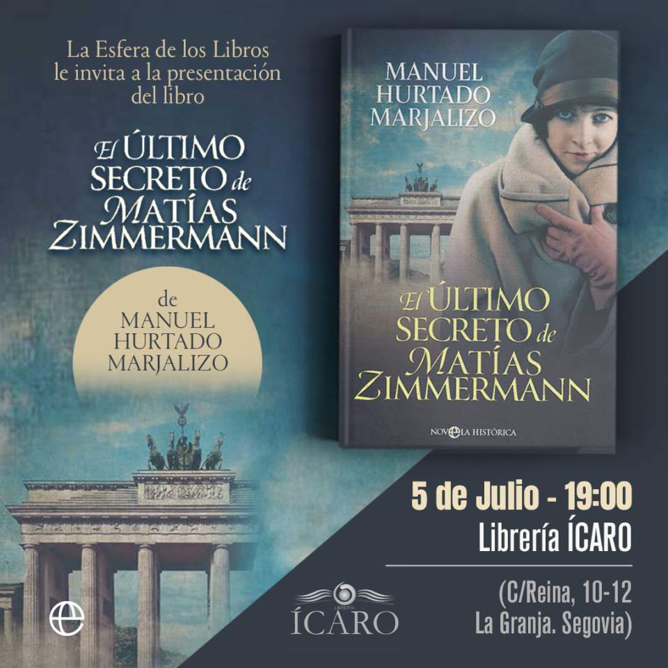 El sábado, 5 de julio, contaremos con Manuel Hurtado Marjalizo en el espacio cultural de la Librería Ícaro de La Granja. A partir de las 19:00h nos presentará su último libro, una novela de dobles identidades y giros inesperados que, a un ritmo trepidante, lleva al lector de Madrid a París, Berlín o Málaga y de la Primera Guerra Mundial en Europa a la España de los años cincuenta. El acto será de acceso libre hasta completar el aforo.