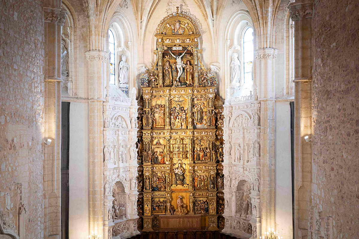 El retablo, realizado en madera dorada y policromada, destaca por su monumentalidad y por la calidad de las escenas escultóricas que lo conforman. Formado por cuatro cuerpos, un ático y un remate, muestra todo un entramado de calles y entrecalles decoradas con relieves de temática cristológica. Con una iconografía más compleja, los cenotafios, realizados en piedra dolomía y alabastro, siguen modelos propios de la tradición castellana, conjugando los usos de diferentes piedras e integrándose con el retablo.