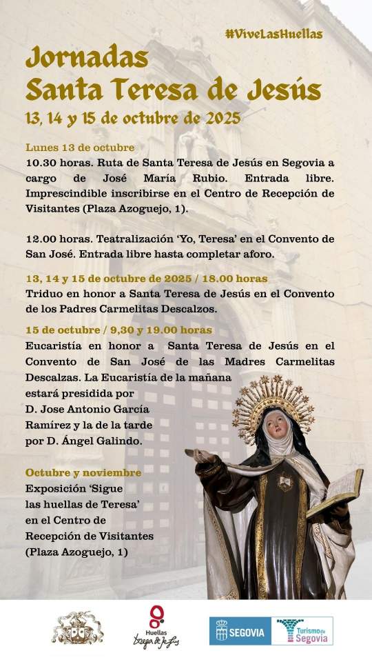 Segovia se une por tercer año consecutivo a la campaña “Vive las Huellas”, una iniciativa que impulsa la Red de Ciudades Teresianas con el objetivo de promover la figura y el legado de Santa Teresa de Jesús a través de actividades culturales, turísticas y espirituales en las distintas ciudades teresianas de España.