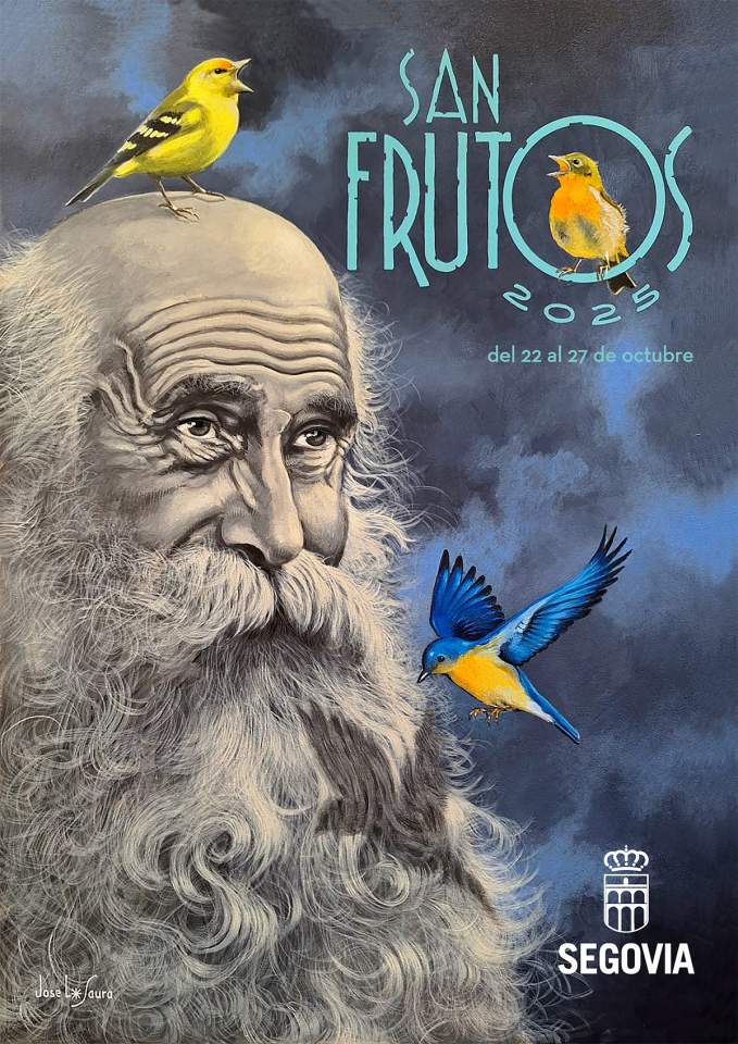 El cartel de esta edición es obra del artista José Luis López Saura y lleva por título “La luz que nos ilumina en otoño”. La obra representa a un San Frutos sabio y sereno, bañado por la luz brumosa del cielo segoviano. Tres aves —un jilguero, un canario y un azulillo picogordo— completan la composición, simbolizando la música que llenará la ciudad durante las fiestas.