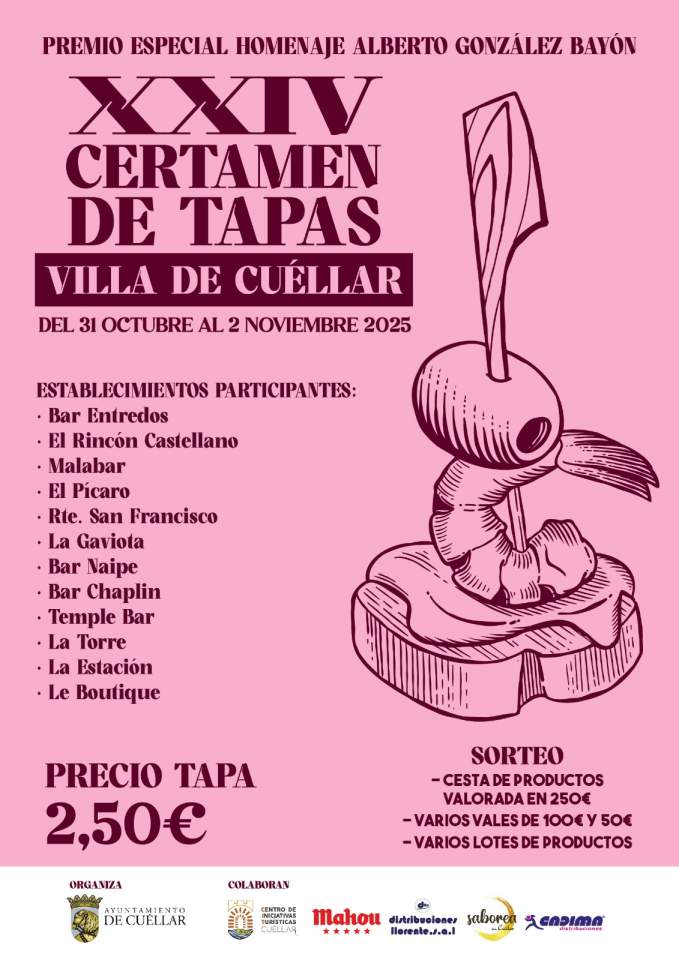 El XXIV Certamen de Tapas “Villa de Cuéllar” se celebrará del 31 de octubre al 2 de noviembre, durante los cuales vecinos y visitantes podrán disfrutar de una auténtica ruta gastronómica por los bares y restaurantes de la localidad. Las tapas, elaboradas con creatividad y producto local, ofrecerán al público una experiencia culinaria única.