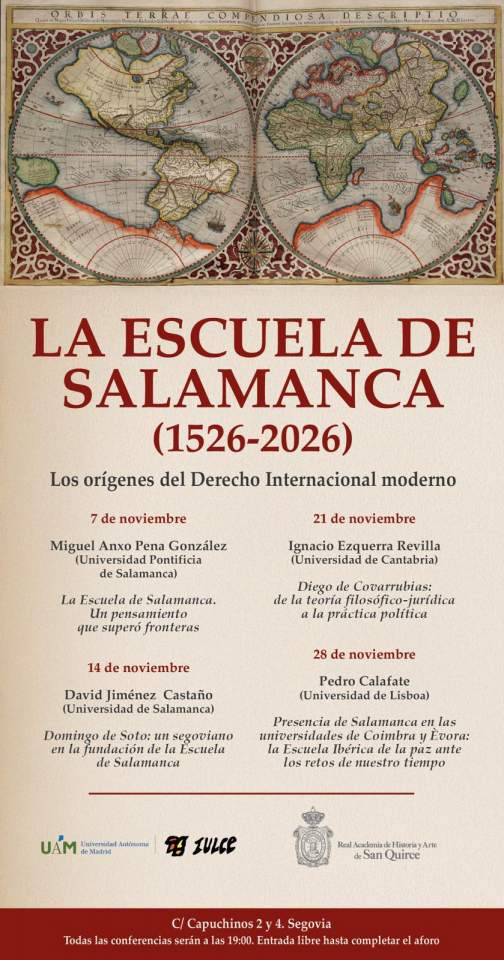La Escuela de Salamanca (1526-2026). Los orígenes del Derecho Internacional moderno es el título del ciclo de conferencias que la Real Academia de Historia y Arte de San Quirce, en colaboración con la Universidad Autónoma de Madrid y el Instituto Universitario La Corte en Europa, organizará durante los viernes de noviembre, anticipándose unos meses a los actos conmemorativos de su 500º aniversario, que tendrán lugar el año próximo en numerosos puntos de España.