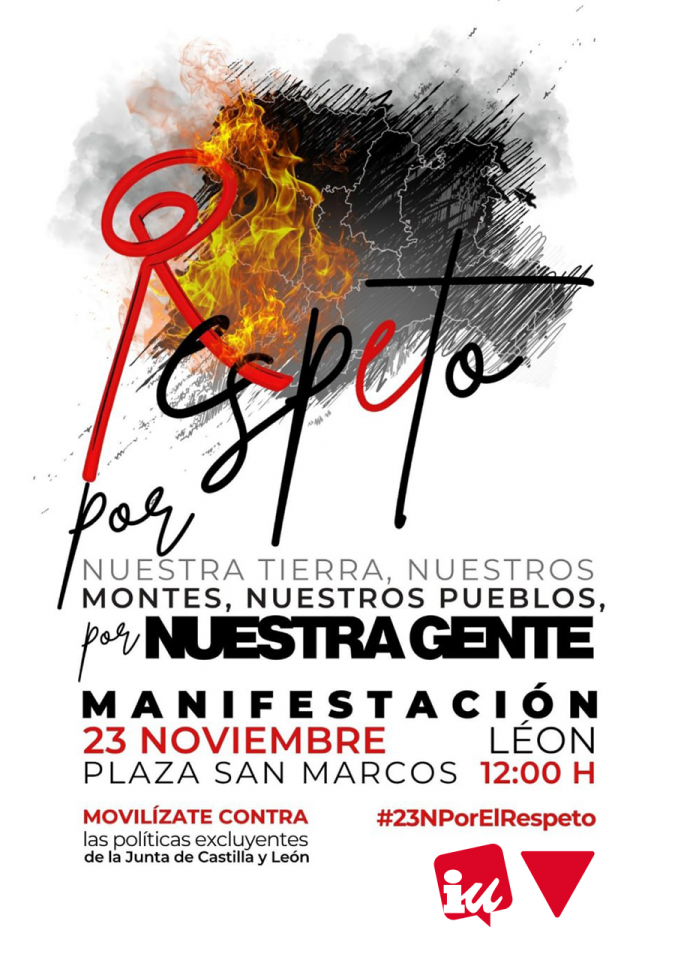 Bajo el lema “Por nuestra tierra, nuestros montes, nuestros pueblos, por nuestra gente”, la Plataforma Respeto convoca nuevamente a la ciudadanía a protestar por la gestión de los incendios el próximo 23 de noviembre en León. La iniciativa nace de los partidos PSOE, Izquierda Unida (IU), Sumar y Podemos en coordinación con los sindicatos Comisiones Obreras, SteCyL y el colectivo de consumidores Cavecal para renegar de las medidas del Ejecutivo de Alfonso Fernández Mañueco (PP). La Plataforma Respeto indica en su Manifiesto que las causas que han propiciado el desastre que vienen de “la dejadez del Gobierno Regional en el cuidado del medio ambiente y de quienes lo habitan”.