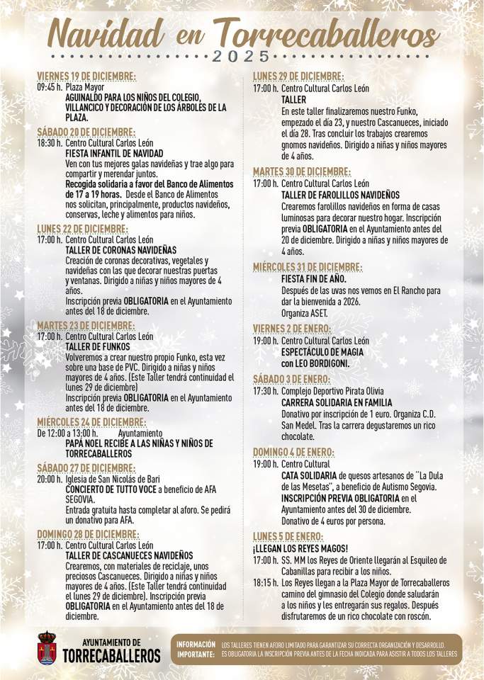 El Ayuntamiento de Torrecaballeros ha organizado un completo programa de actividades navideñas entre el 19 de diciembre y el 5 de enero “con propuestas para todas las edades y con un marcado carácter solidario con actividades a favor de la Asociación de Familiares de Alzheimer (AFA-Segovia), el Banco de Alimentos y Autismo Segovia”, señala el Alcalde, Rubén García. “Además, y tras la gran acogida de los últimos años, hemos organizado también un concurso de decoración navideña de fachadas, ventanas, balcones y jardines”, subraya.