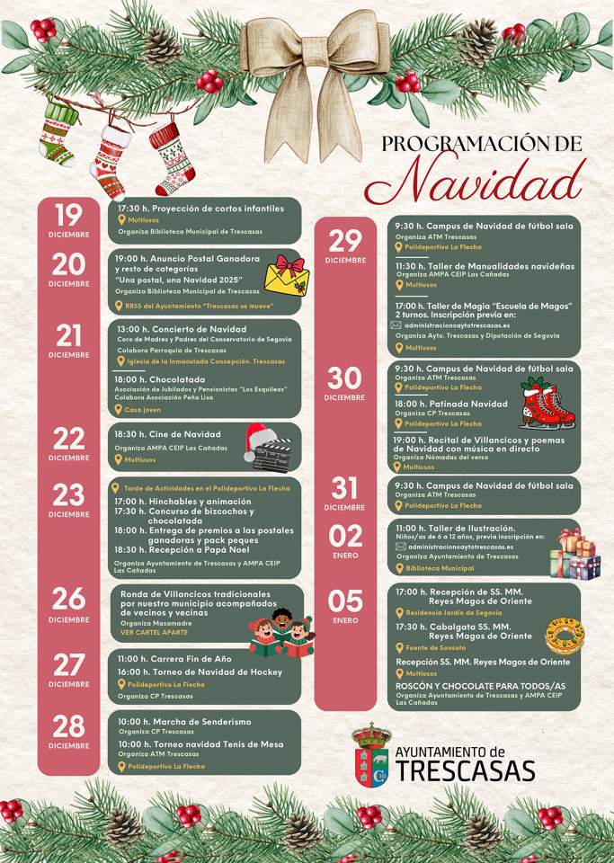 El Ayuntamiento de Trescasas ha preparado un completo programa de actividades para celebrar la Navidad con los vecinos y vecinas del municipio y todos aquellos visitantes que así lo deseen. La propuesta incluye música, cine, deporte, talleres, actividades infantiles y las tradiciones más esperadas de estas fechas.