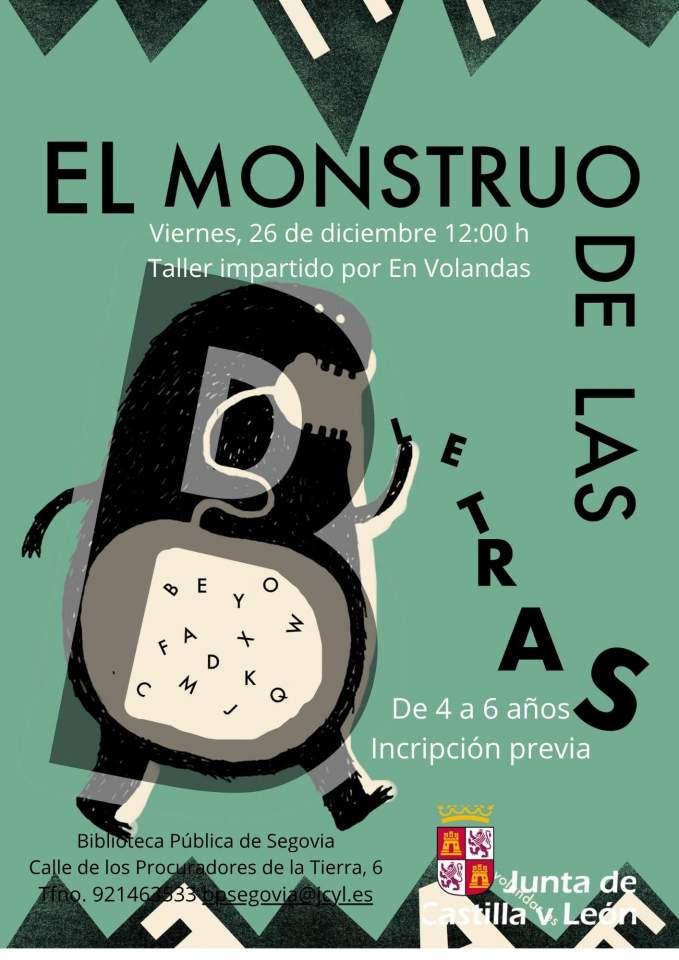 El martes 23 de diciembre, a las 12.00 horas, tendrá el taller ‘Cartas a las olas’, con Ana Margú, para niños de entre 6 y 9 años. El viernes, 26 de diciembre, a las 12.00 horas, llega otro taller, está vez para niños de 4 a 6 años y dirigido por el grupo ‘En volandas’, con el título ‘El monstruo de las letras’.