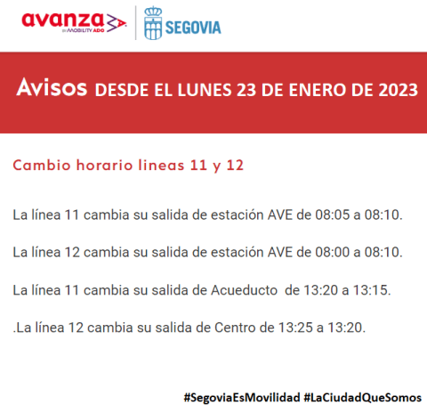 El Ayuntamiento de Segovia informa de los nuevos horarios de las líneas 11 y 12 de los autobuses urbanos de Segovia, modificados como [...] Leer más...